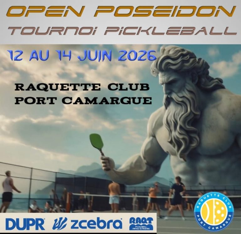 Depuis 2023, le Raquette Club de Port-Camargue est fier d'organiser l'Open Poséidon chaque année en Mai, un tournoi qui rassemble les compétiteurs et les passionnés de Pickleball.